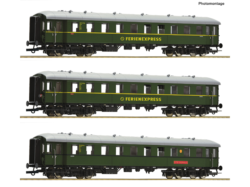 Set obsahuje dva osobní vozy 3.třídy typu C4ywe a osobní vůz 3.třídy typu CR4ywe s jídelní částí. Vozy s vybaveným interiérem. Kinematika krátkého spřáhla dle NEM 362. Nejmenší poloměr oblouku 358 mm. Není vhodné pro děti do 14 let.