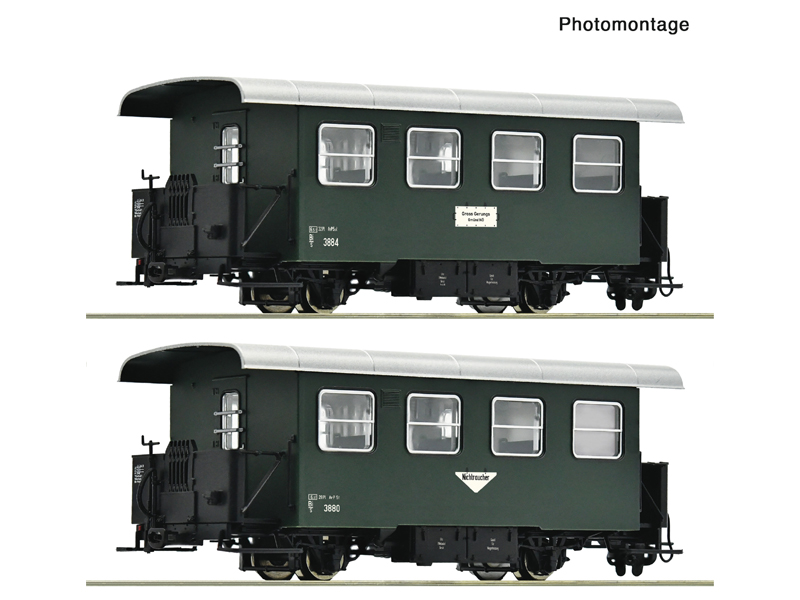 Set dvou úzkorozchodných osobních vozů typu Bi/s. Nejmenší poloměr oblouku 200 mm. Není vhodné pro děti do 14 let.
