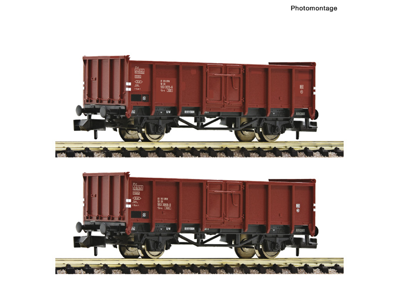 Set dvou otevřených vozů typu E. Jeden z vozů se známkami stárnutí. Kinematika krátkého spřáhla dle NEM 355. Nevhodné pro děti do 14 let.