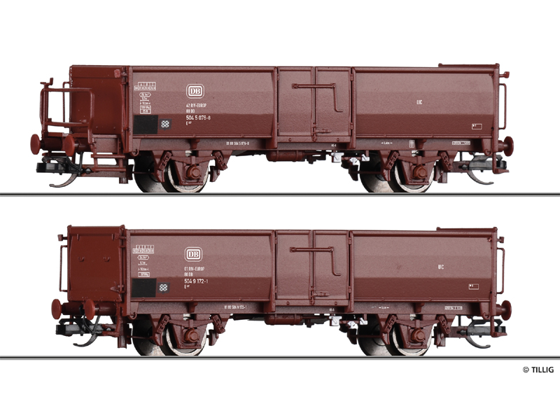 Set dvou otevřených nákladních vozů E 037 naložených černým uhlím. Kinematika krátkého spřáhla s šachtou dle NEM. Nevhodné pro děti do 14 let.