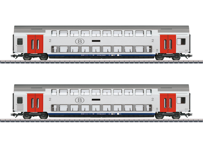 Předloha: Dva dvoupatrové vozy SNCB typu M6 2. třídy. Světle šedé zbarvení. Provozní stav od roku 2023. Model: Minimální poloměr oblouku 360 mm. Připraveno pro instalaci vnitřního osvětlení 73141 a vodivých úzkých spřáhel 72020/72021. Oba vozy jednotlivě baleny v dodatečném vnějším obalu. Dvojkolí DC E700580. Dvojkolí Trix Express E258259. Odpovídající lokomotivu naleznete v sortimentu Märklin H0 pod číslem položky 36646. Kinematika krátkého spřáhla podle NEM. Není vhodné pro děti do 15 let.