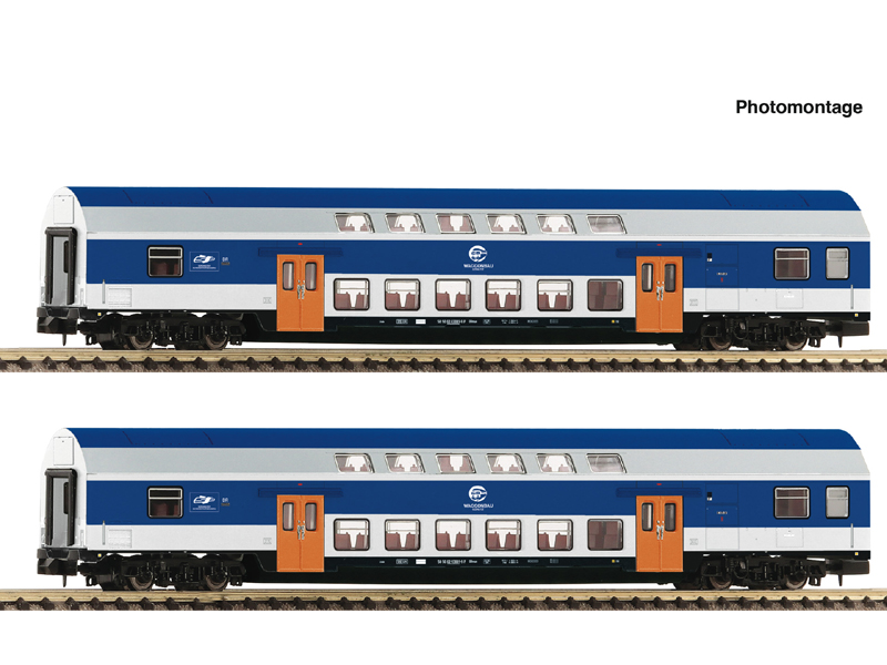 Set dvou osobních patrových vozů typu DBmue. Vozy s vybaveným interiérem. Příprava pro vestavbu vnitřního osvětlení k.č. 4080001. Kinematika krátkého spřáhla dle NEM 355. Nejmenší poloměr oblouku 192 mm. Není vhodné pro děti do 14 let.