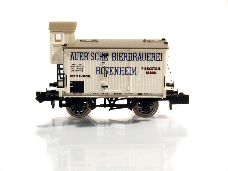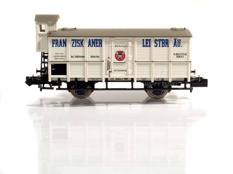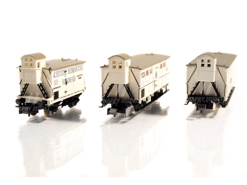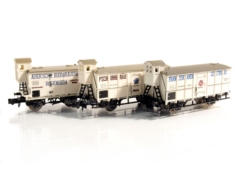 Set obsahuje tři různé soukromé pivní vozy ve dvou různých provedeních pivovarů Franziskaner-Leistbräu, Pschorrbräu Munich a Auersche Bierbrauerei Rosenheim, používané na Královských bavorských státních drahách (K.Bay.Sts.B. ). Verze s brzdařskou budkou. Kinematika krátkého spřáhla s šachtou dle NEM. Určeno pro uživatele starší 15 let.