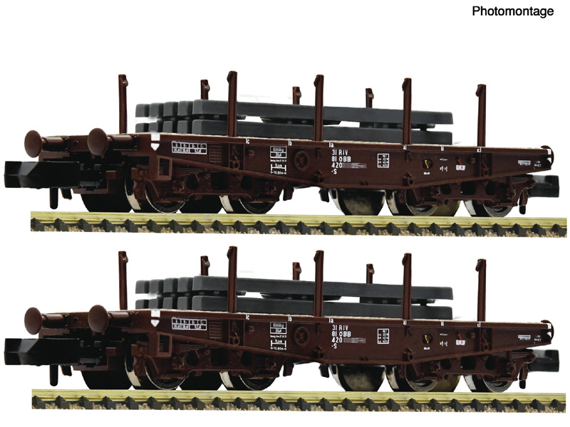 Set dvou těžkotonážních plošinových vozů S s nákladem desek. Kinematika krátkého spřáhla dle NEM 355. Nevhodné pro děti do 14 let.