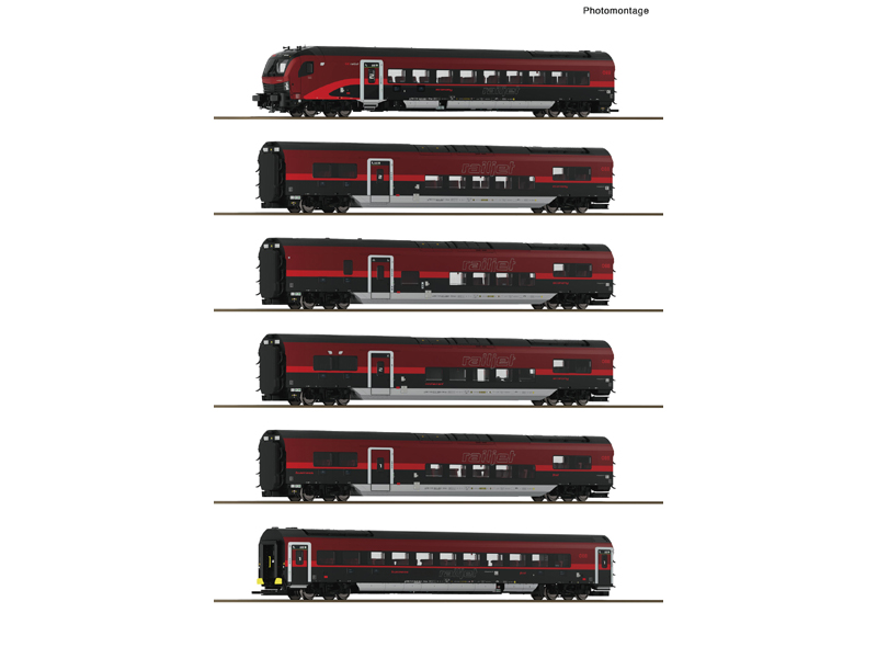 Vestavěný digitální dekodér. Šesti dílná souprava Railjet ÖBB se skládá z řídícího vozu Economy Class (Bfmpz), vozu First Class (Ampz), Bistro vozu (BRmpz), společenského vozu (Bbmpvz), vozu Economy Class (Bmpz) a koncového vozu Business / First Class (Ampz). Detailně propracované modely, samostatně aplikované díly. Vozy s vybaveným interiérem. LED osvětlení, digitálně přepínatelné. Kinematika krátkého spřáhla dle NEM 362. Nejmenší poloměr oblouku 358 mm. Není vhodné pro děti do 14 let.