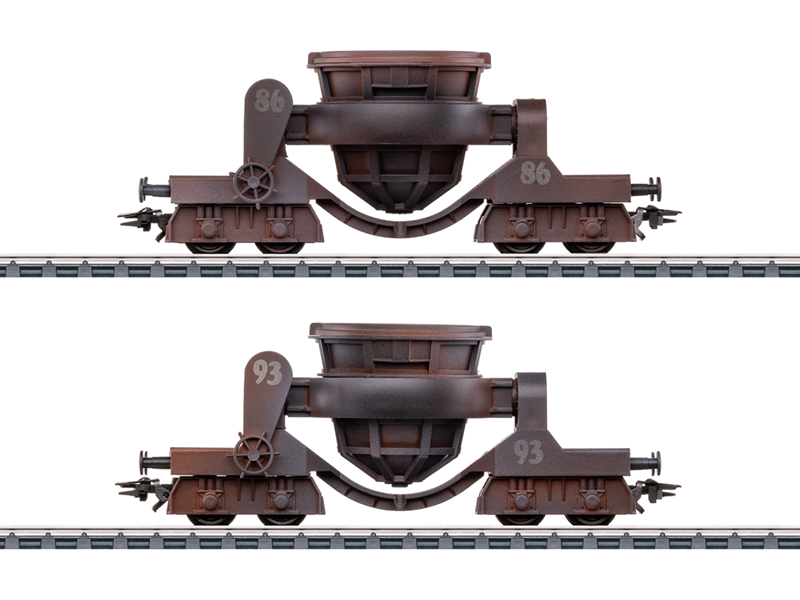 Předloha: Dva speciální vagóny pro přepravu strusky. Soukromé vagóny podle předlohy z ocelářského průmyslu. Základní barva měděně hnědá. Provozní stav z poloviny 50. let 20. století. Model: Kovový rám. Pánev se naklápí a je odnímatelná. Lak s autentickými známkami opotřebení. Oba vagóny jednotlivě baleny v dodatečném vnějším obalu. Výměnu dvojkolí za izolovaná provedeme zdarma. Délka přes nárazníky jednoho vozu 10,8 cm. Nevhodné pro děti do 15 let.
