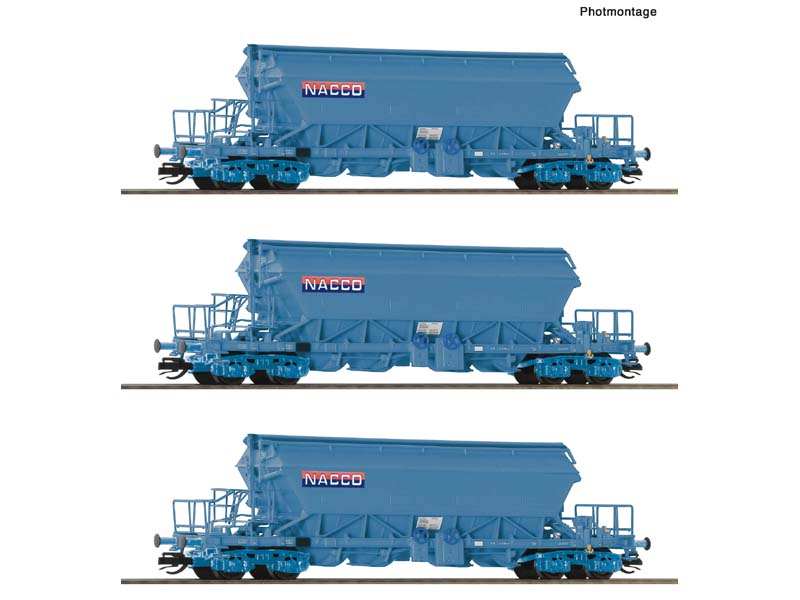 Set tří nákladních vozů na sypké hmoty, typ Taoos, společnosti NACCO. Samostatně přidělané detaily, otevírací střecha. Kinematika krátkého spřáhla dle NEM 358. Nevhodné pro děti do 15 let.