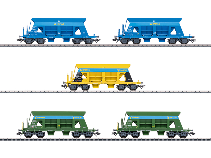 Set obsahuje 5 čtyřnápravových samovykládacích vozů typu Falls společnosti HATAG Kies AG. Provozní stav z roku 2011. Nevhodné pro děti do 15 let.