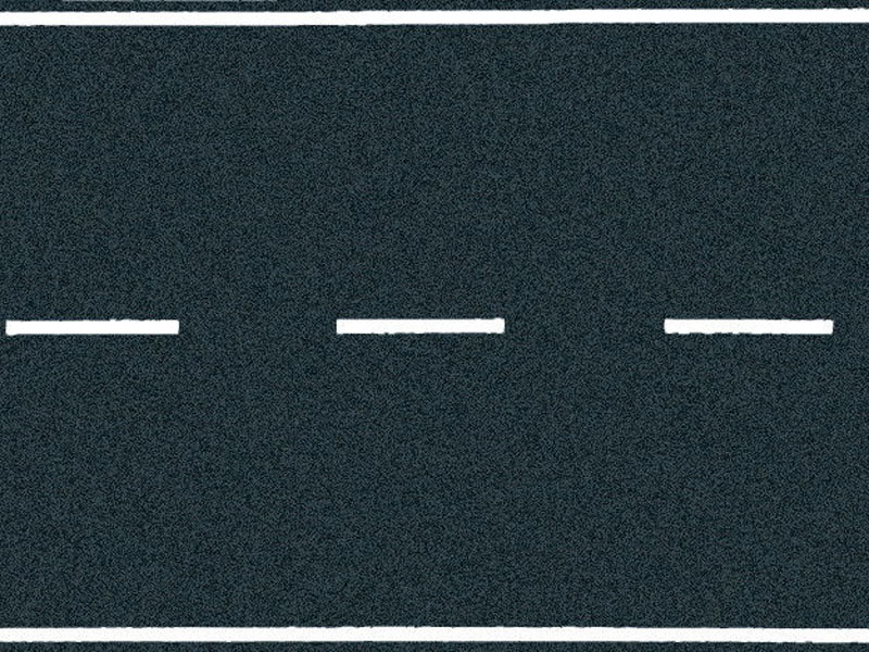 Celková šířka 40 mm, délka 1 m. Silnice je vyrobena ze speciální elastické otěruvzdorné fólie. Mírné zatáčky je možno vytvořit přímo díky pružnosti fólie. Pro vytvoření prudké zatáčky použijte – Univerzální zatáčku k..č. 34201. Silnice je po sejmutí ochranné fólie na spodní straně samolepící. Určeno pro velikost N. Nevhodné pro děti do 15 let.