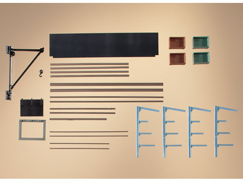 BAUKasten Systém. Stavebnice venkovního skladování tyčového materiálu obsahuje: konzolové regály, zastřešení, tyčový materiál, nástěnný otočný jeřáb, sklápěcí dveře do sklepa a přepravky. Sklad: 96 x 20 x 46 mm, jeřáb: 47 x 27 mm.