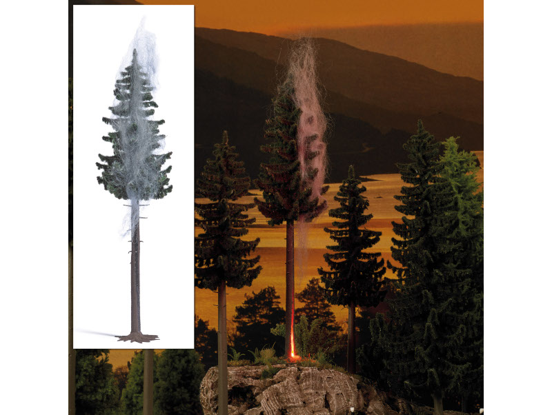 Smrk na vysokém kmeni, který právě zasáhl blesk. Díky LED pásku vloženém v kmeni stromu vzniká realistická scéna hořícího stromu. (14-16V). Výška: 160 mm.