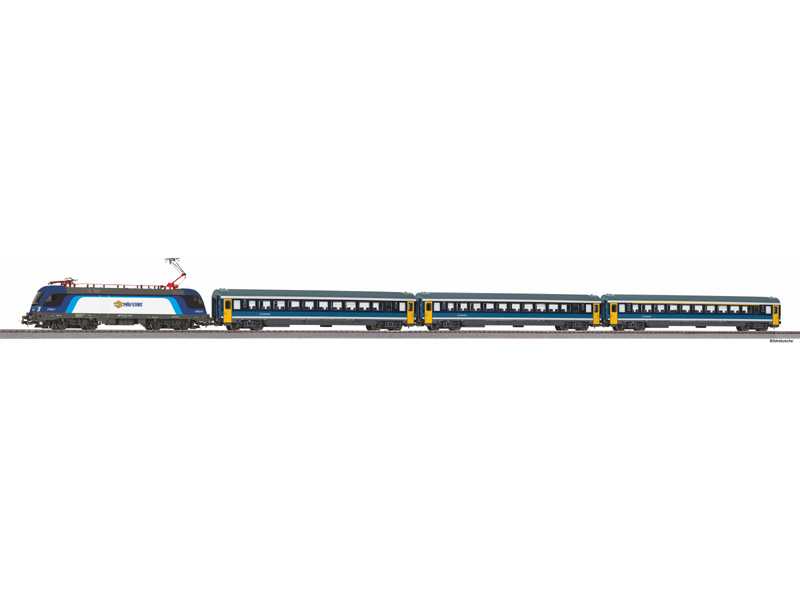 Startovací set obsahuje: 1x elektrická lokomotiva řady Taurus, 3x osobní vůz, 12x oblouková kolej 55412 (R2 422mm), 5x přímá kolej 55401 (231mm), 1x přímá připojovací kolej 55406, 1x 55447, 1x 55270 napájecí svorky, 1x 55499 nakolejovač, 1x napájecí zdroj 5,4VA, regulátor rychlosti, návod k obsluze. Základní rozměr: 1580 x 880mm, minimální plocha pro instalaci: 1680 x 980 mm. Všechny koleje s podložím. Není vhodné pro děti do 14 let.