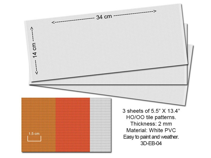 Reliéfní plastové desky lze použít pro silnice, chodníky, i zdi v měřítku H0/00. Snadné barvení emailovými i akrylovými barvami. Sada obsahuje 3 desky, každá o rozměrech 16 x 34 cm, tloušťka 2 mm v bílé barvě.