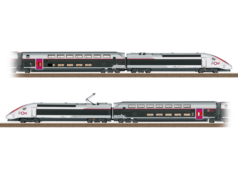 Předloha: Vysokorychlostní vlak TGV INOUI (Euroduplex). Prémiová nabídka od francouzských státních drah (SNCF) s větším komfortem a službami. Verze pro dopravu mezi Paříží a Mnichovem. Složení: 2 hnací vozy (M1 a M2), patrový průchozí vůz (R1) 1. třídy, patrový průchozí vůz (R8) 2. třídy. Provozní číslo jednotky 4713. Aktuální provozní stav 2025. Model: Čtyřdílná základní sada. Obě hnací hlavy (M1 a M2) jsou motorizované. S digitálním dekodérem a rozsáhlými zvukovými funkcemi. Regulovaný vysoce výkonný pohon v obou motorových vozech, instalovaný centrálně. V každé hnané hlavě poháněné 4 nápravy přes kardan, trakční bandáže. Standardně instalováno vnitřní osvětlení. Trojité světlomety, které se mění v závislosti na směru jízdy, 2 červená obrysová světla a vnitřní osvětlení v konvenčním provozu, lze ovládat digitálně. Třetí světlomet lze samostatně digitálně vypnout. Osvětlení bezúdržbovými teplými bílými a červenými světelnými diodami (LED). S energetickou vyrovnávací pamětí. Kabiny strojvedoucího v motorových vozech s vnitřním vybavením. Samostatně připevněná kovová madla. Pohonný vůz a přechodový vůz jsou pevně spojeny v párech pomocí speciálních krátkých spřáhel a vodících táhel. Spojení kinematickou kulisou ve středním podvozku Jakobs. Napájení závislé na směru přes přední hnací vůz. Vnitřní osvětlení je napájeno průběžnou elektrickou přípojkou v celém vlaku. Každý motorový vůz se 2 jednoramennými pantografy v různých provedeních, každý s vahadlem pro DB a SNCF. Pantografy fungují pouze mechanicky, nikoli elektricky. Minimální poloměru 360 mm. Základní sadu 22482 lze rozšířit na realistickou 10-dílnou jednotku o další sady vozů 23187, 23188 a 23189. SNCF a TGV jsou registrované ochranné známky společnosti SNCF. TGV® je ve vlastnictví SNCF. Jakékoli právo na reprodukci je vyhrazeno. Není vhodné pro děti do 15 let.