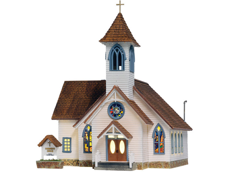 Hotový model dřevěného venkovského kostela. Součástí balení je mnoho dekorativních doplňků. Vnitřní LED osvětlení. Rozměr: 13,3 x 17,3 cm, výška: 18,7 cm. Nevhodné pro děti do 14 let!