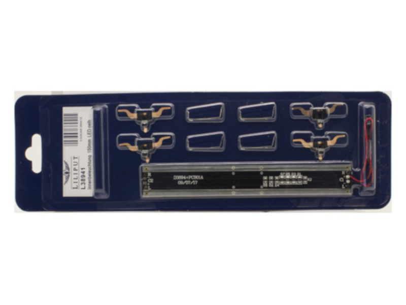 Sada vnitřního osvětlení včetně sběračů proudu. Kondenzátor pro zamezení poblikávání. Žluté LED napodobuji starší žárovkové osvětlení. Vodné pro všechny napájecí systémy. Je možno instalovat i do vagónu jiných výrobců.