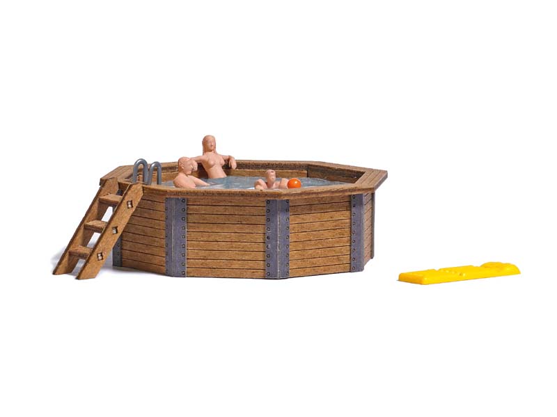 Stavebnice zahradního bazénu s dřevěnou obrubou z pravého dřeva. Se vstupními schůdky, realistickou vodní hladinou, vodním míčem a nafukovací matrací. Součástí jsou i tři koupající se figurky (nebarvené). Průměr bazénu 50 mm, výška 15 mm. Není vhodné pro děti do 14 let.