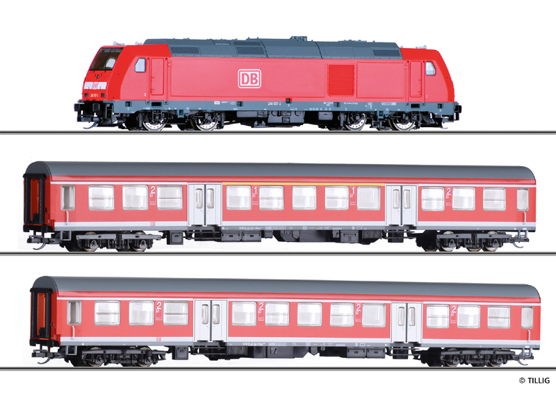 Startovací sada: Osobní vlak DB AG, sestávající z dieselové lokomotivy TRAXX a dvou osobních vozů typu Halberstadt 2.třídy. Set dále obsahuje kolejový ovál z kolejiva na podloží, regulátor rychlosti TILLIG (bez výstupu pro příslušenství), nakolejovadlo. Čelní a koncové osvětlení LED přepínané v závislosti na směru jízdy. Kinematika krátkého spřáhla s šachtou dle NEM. Nevhodné pro děti do 14 let.