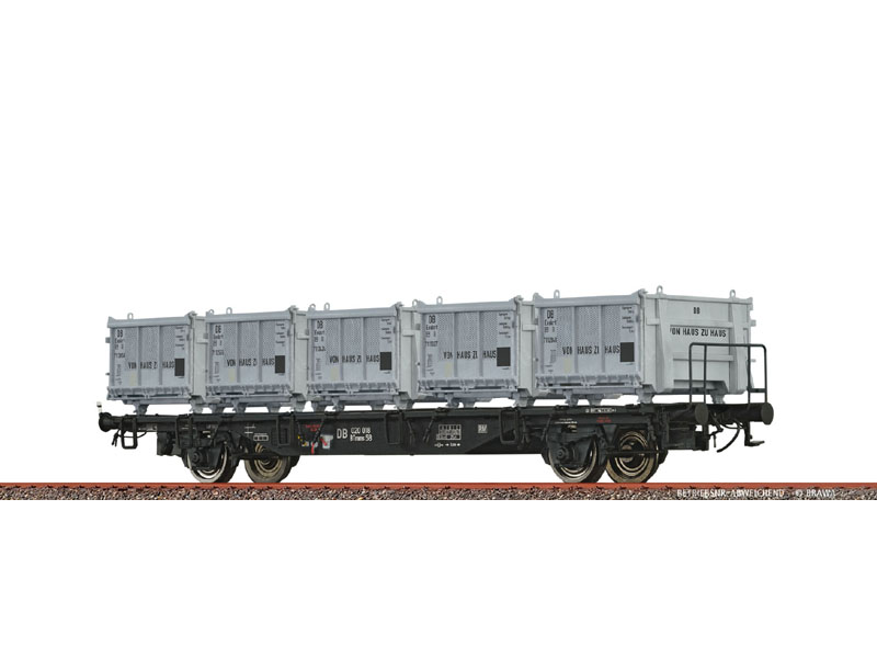 Vůz naložen pěti kontejnery. Tříbodové uložení náprav. Rám z tlakově litého zinku. Brzdové čelisti v úrovni kol. Samostatně připevněné táhlo nápravových brzd. Samostatně připevněný brzdový systém. Verze s plošinou pro brzdaře. Odnímatelné kontejnery. Kinematika krátkého spřáhla s šachtou dle NEM. Provozní číslo 21 80 411 3 837-9. Von Haus zu Haus je chráněná obchodní značka. Nevhodné pro děti do 14 let.