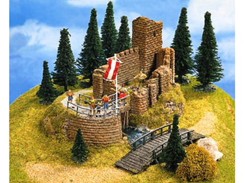 Rozměry 16 x 13 cm, výška 10 cm. Vhodné pro velikosti H0,TT, N. Výrobek je vyroben z tvrzené pěny, je ručně kolorován. Díky tomu je extrémně lehký. Lze ho bez problémů řezat nožem, pilkou či pilovat. Hrad je dodáván jako hotový model. Nevhodné pro děti do 15 let.